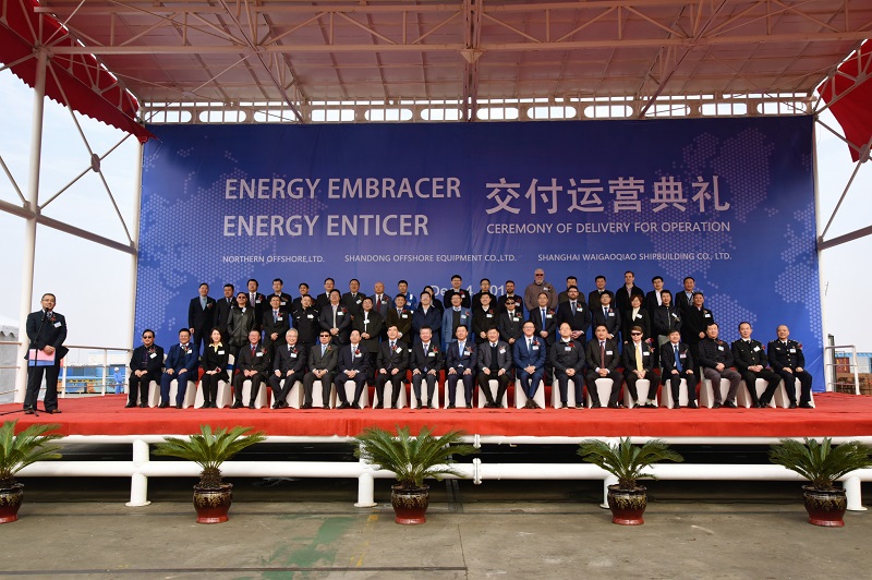 12月4日,公司旗下海工裝備兩座高性能自升式鉆井平臺(tái)Energy Embracer與Energy Enticer在上海外高橋造船有限公司順利交付運(yùn)營(yíng),兩座平臺(tái)將前往卡塔爾北部海域,為卡塔爾國(guó)家石油公司提供海上油氣鉆井服務(wù)。山東省工業(yè)和信息化廳副廳長(zhǎng)靖士寬,上海外高橋造船有限公司董事長(zhǎng)王琦,集團(tuán)公司黨委副書(shū)記、總經(jīng)理趙顯福出席儀式并致辭,集團(tuán)公司副總經(jīng)理、公司黨委書(shū)記、董事長(zhǎng)于冰,公司黨委副書(shū)記、首席執(zhí)行官粟斌,公司首席技術(shù)官孫遠(yuǎn)慧和公司副總經(jīng)理李亞?wèn)|參加儀式。